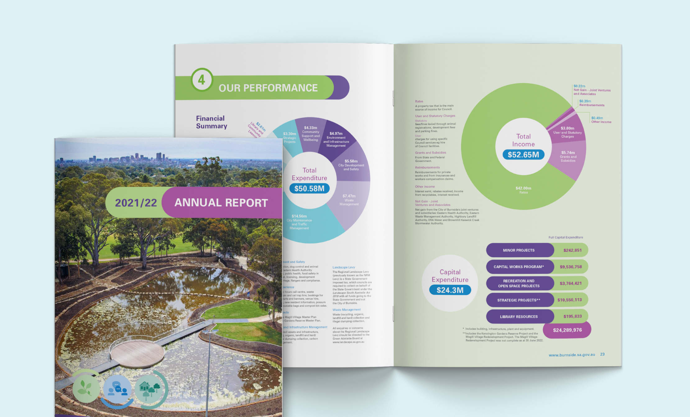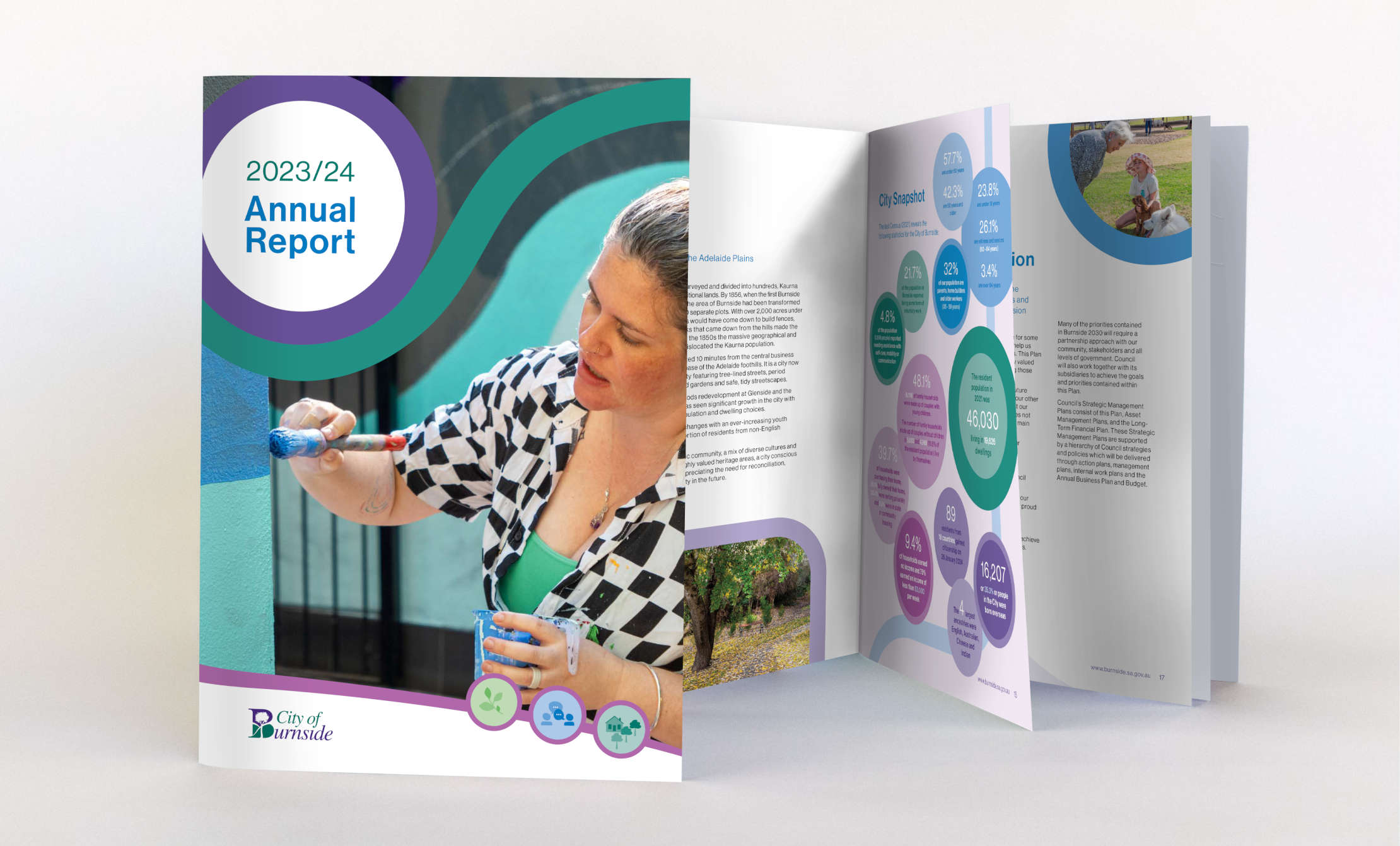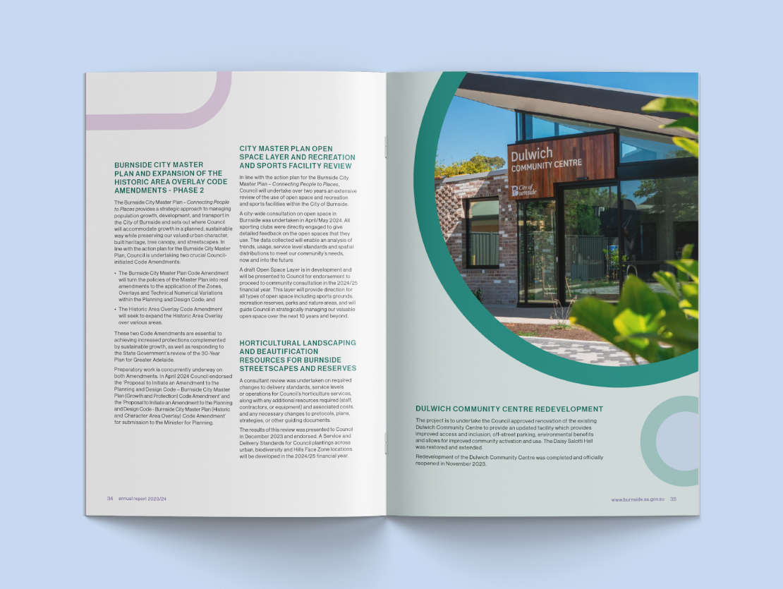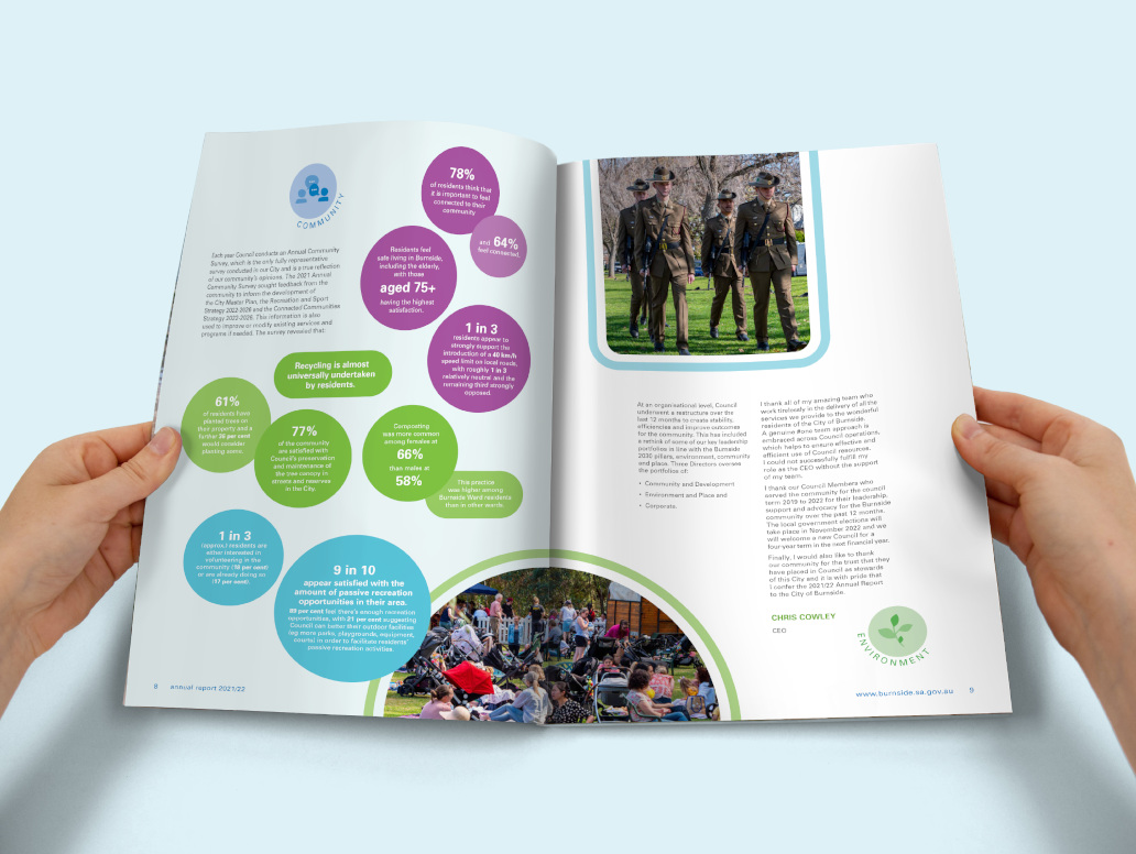 Advocacy ultimately helps councils meet the community needs. We prepare many Advocacy documents for councils and these are increasingly becoming more important to help with the planning of long term goals and objectives. We also do many other corporate documents for Burnside including Strategic and Business Plans, Annual Reports and resident Consultations, each with their own unique and engaging design.